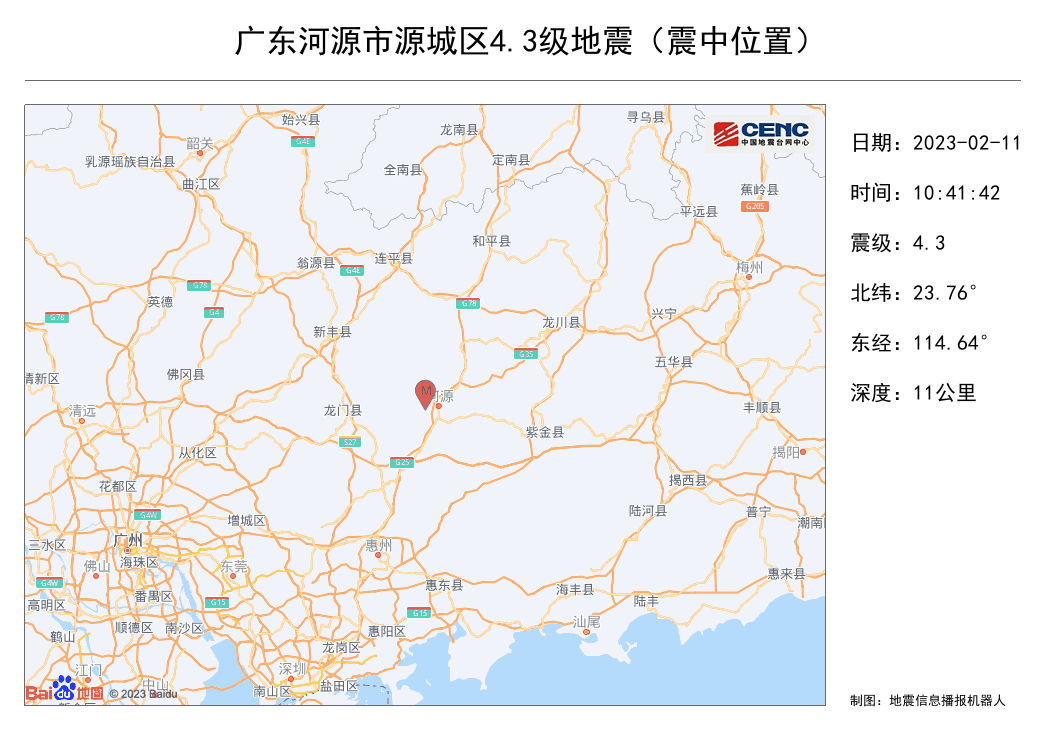 A 4.3-magnitude earthquake hit Yuanchen District, Heyuan City, Guangdong Province (23.79 degrees north latitude, 114.64 degrees east longitude) at 10:41 on February 11th, with a focal depth of 11 kilometers. It was felt in Guangzhou, Shenzhen, Dongguan, Meizhou and other cities. The epicenter was 6 kilometers away from urban area of Heyuan, and 157 kilometers away from downtown Guangzhou.